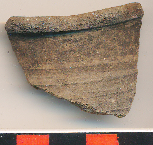 Fekete foltos drapp külső felületű, belsejében drapp felületű,korongolt edény gömbölyű válla íves nyak indításával. A vállon sűrűn benyomott körbefutó szélesebb sávok.