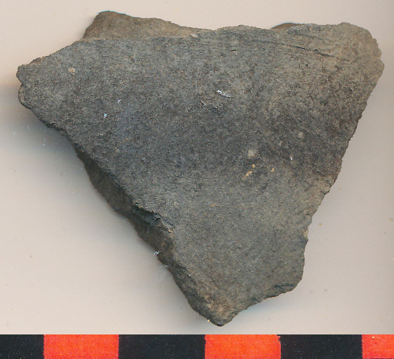 Sötétszürke, kívül fekete foltos, vastag falú oldaltöredék.