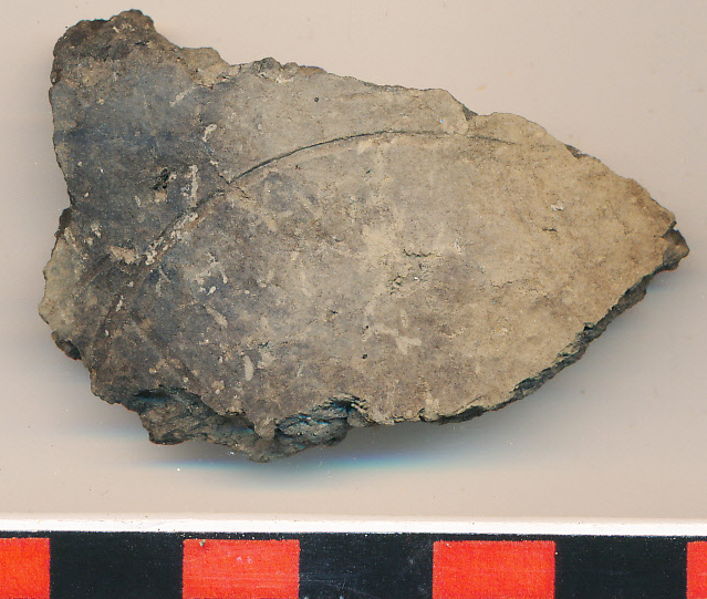 Fekete, kívül sárga foltos, kerámiazúzalékkal soványított, vékony falú íves oldaltöredék, szabálytalan sekélyen karcolt vonalakkal.