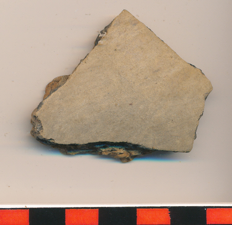 Világos sárgásbarna, a fényezett felület alatt vékony sötétszürke réteggel, kevés kerámiazúzalékkal soványított, vékony falú edény enyhén íves oldaltöredéke.