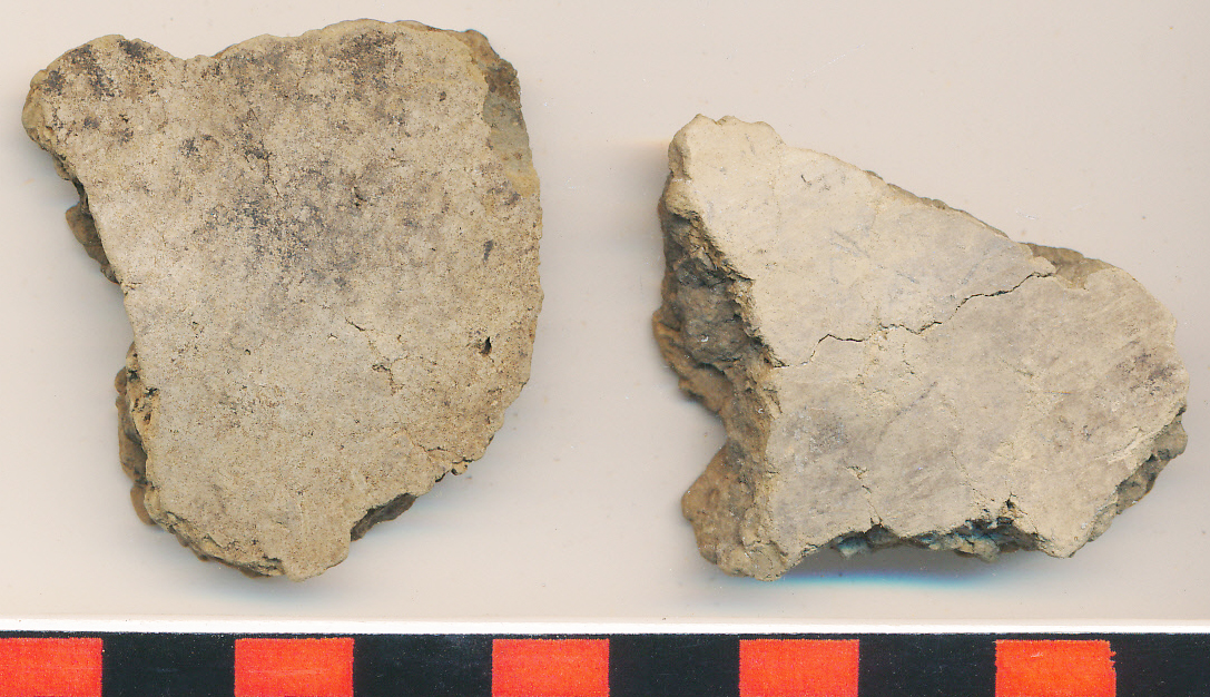 Piszkos sárga külső-belső felületű, fekete törésű, kerámiazúzalékkal erősen soványított, durvább kivitelű oldaltöredékek.