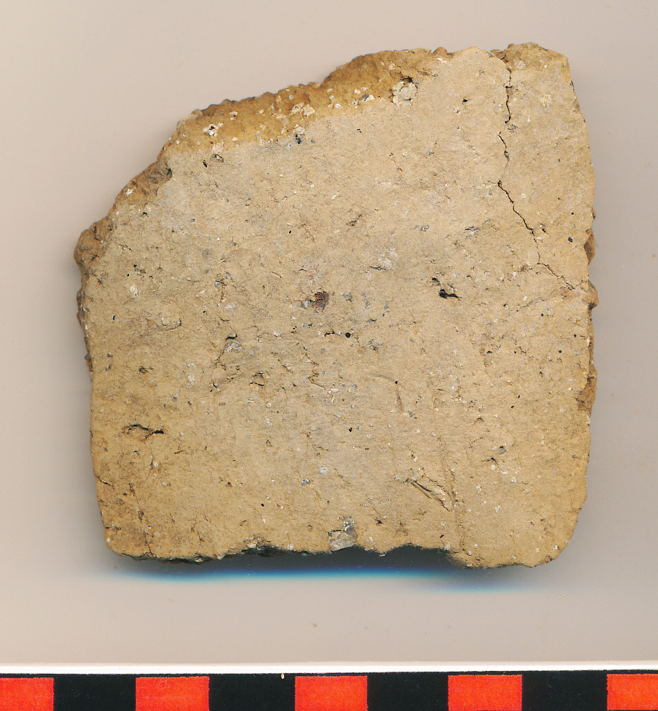 Szürkésdrapp, apró kerámiazúzalékkal és fehér szemcsékkel soványított, nehéz és tömött anyagú, eldolgozott felületű vastagabb oldaltöredék.