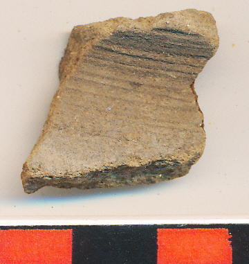 Világosbarna, vékony falú, korongolt íves nyaktöredék sűrűn karcolt vékony vonalakkal. Talán az előző edény töredéke..