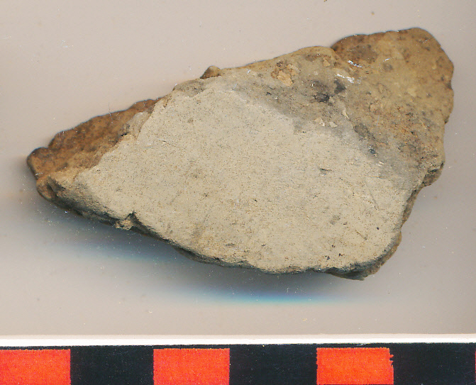 Kívül-belül eldolgozott sárgásszürke oldaltöredék.