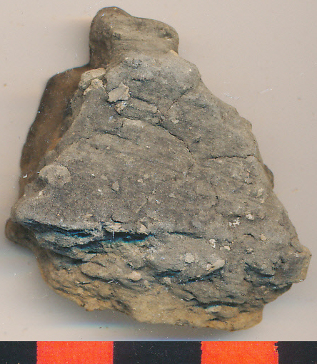 Szürkésfekete, belül sárga foltos, durvább kidolgozású, kerámiazúzalékkal soványított, kopott íves nyaktöredék.