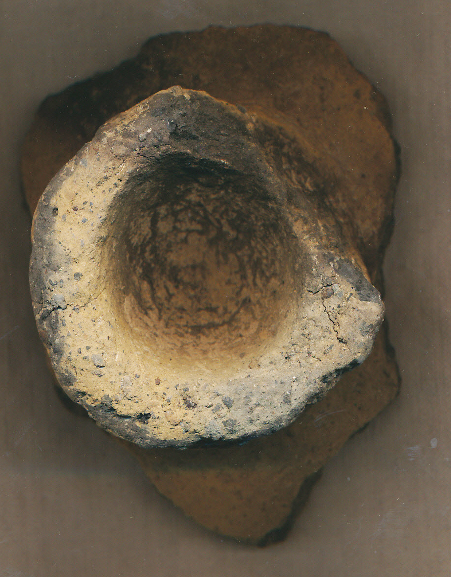 Sárga külső felületű, kerámiazúzalékkal soványított, korong nélkül készített nagyobb, vastag falú fedő fogórésze, felülről mélyen benyomva.