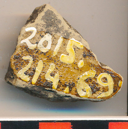 Piszkossárga, belsejében egyenetlen, vékony falú, kopott oldaltöredék.