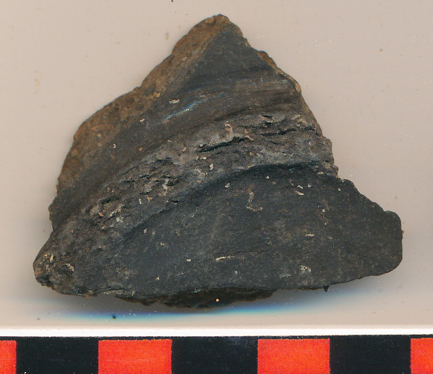 Fekete, kevés kerámiazúzalékkal soványított edény meredek oldalfala a letöredezett szélű, enyhén profilált alj indításával.