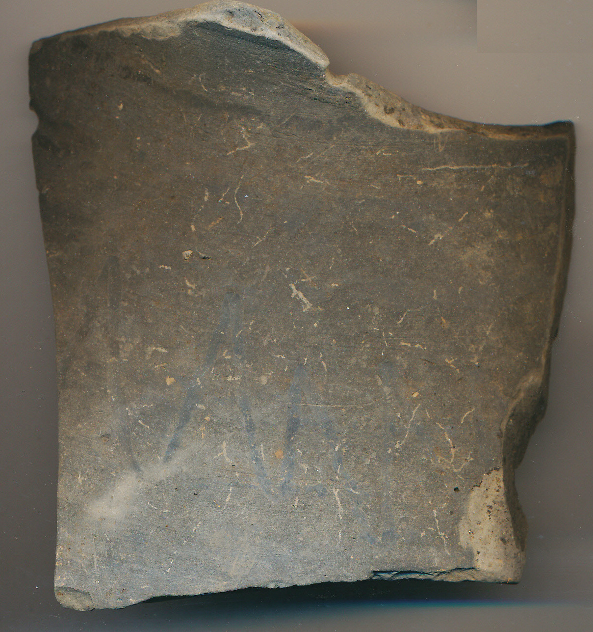 Középszürke, kívül sötétre simított felületű, korongolt, vékony falú nagyobb edény enyhén domború válla besimított széles hullámvonallal, íves nyak indításával.