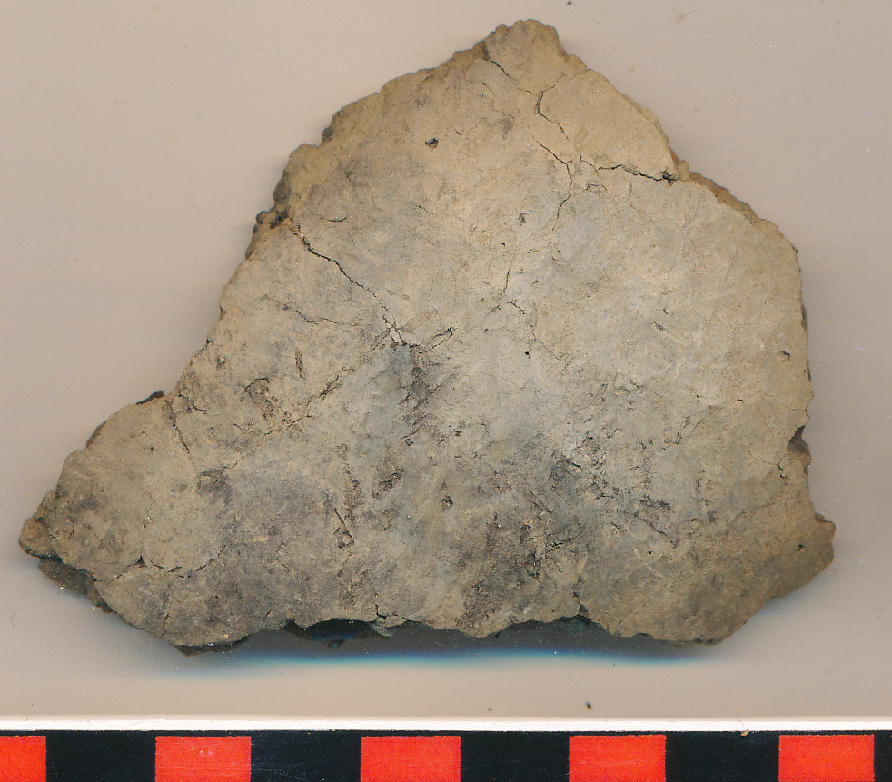 Világosszürke külső felületúű, belsejében sárga, kívül-belül eldolgozott, íves oldaltöredék.