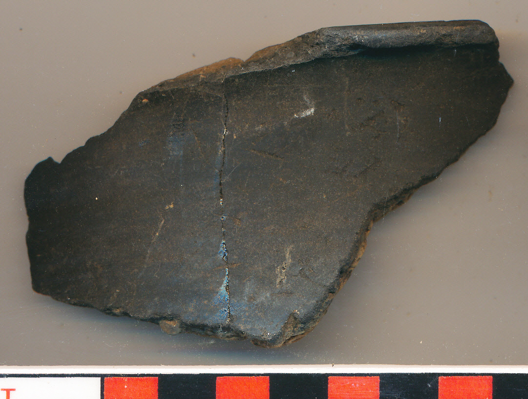 Fényezett fekete külső felületű, téglaszínű törésű, nagyon kevés kerámiazúzalékkal soványított, nagyobb edény erősen kihajló, belül síkozott peremének töredéke. 2 db-ból ragas6ztott.
