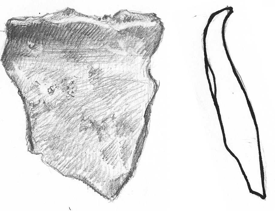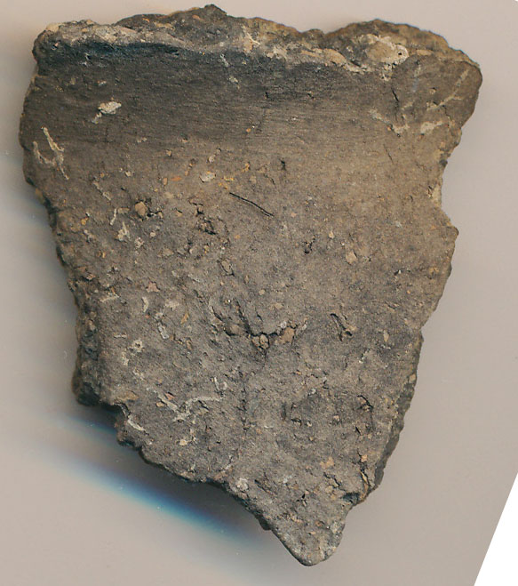 Szürkésfekete, belső felületén barnás téglaszínű, kerámiazúzalékkal soványított, korong nélkül készített kisebb edény egészen enyhén íves válla az íves nyak indításával.