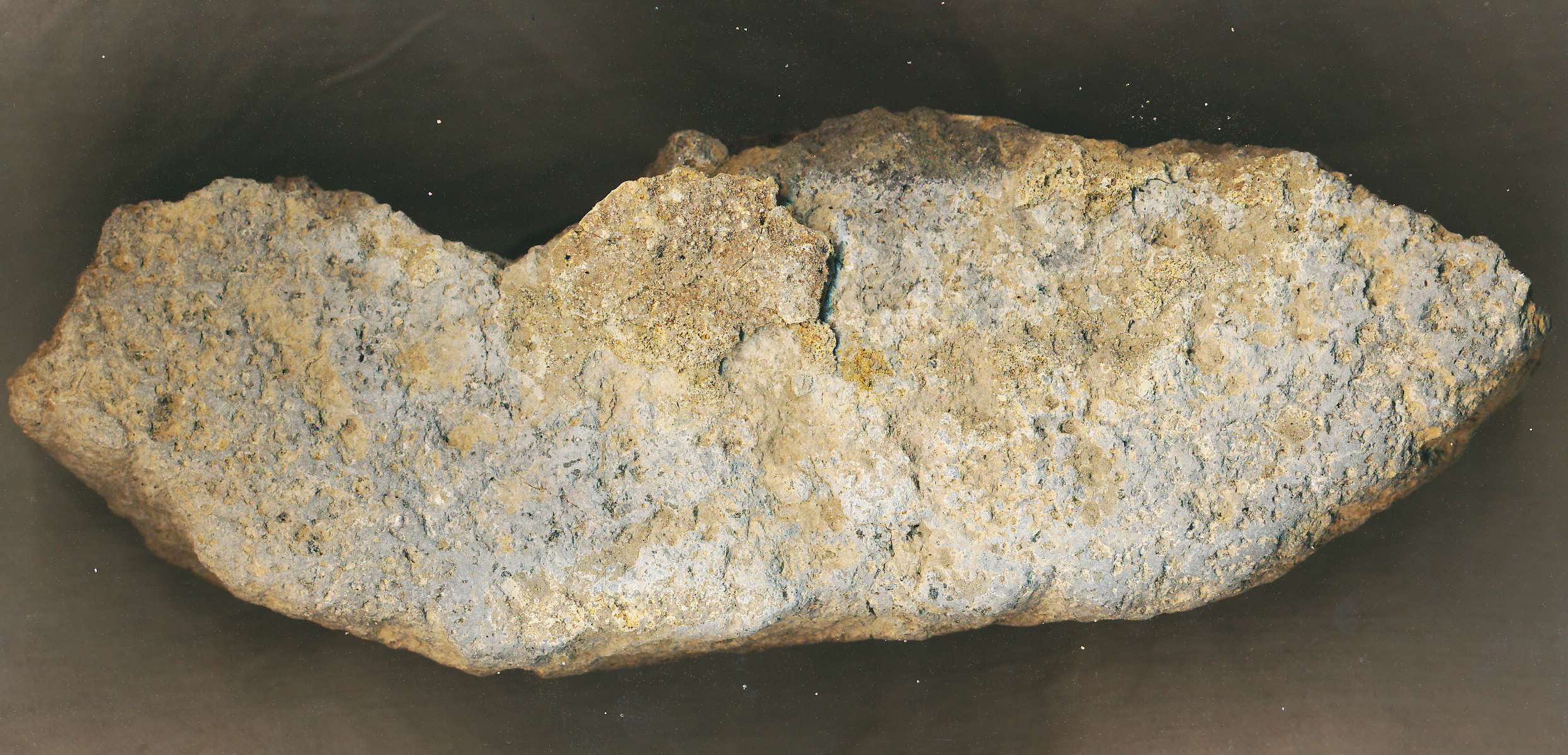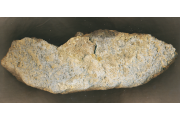 Cipó alakú, egyik oldalán vízszintes, a másikon domború, szürke, vörös szemcsés andezitből faragott nagy malomkő töredéke a peremből.
