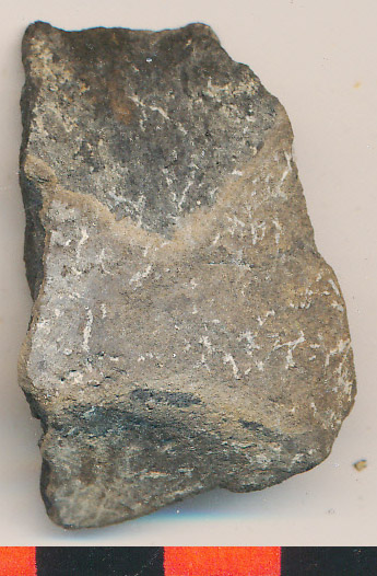 Külső-belső felületén eldolgozott barna, fekete törésű kisebb edény vágott aljtöredéke az ívesen induló felmenő fal indításával.