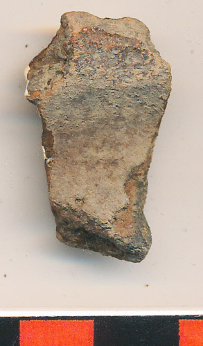 Kívül-belül szürkésbarna felületű, fekete törésű kisebb edény erősen íves nyaktöredéke.