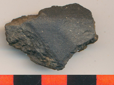 Fekete, jól eldolgozott külső felületű, bikónikusan megtörő hasú edény vastag falú kis oldaltöredéke.