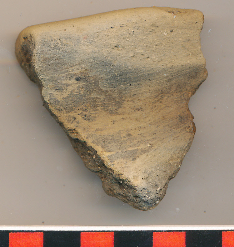 Sárga külső-belső felületű, szürke foltos, szürke törésű, homokos-érdes tapintású nagy edény kissé kihajló, elvékonyodó, ívesen legömbölyített, erősen kopott peremtöredéke.