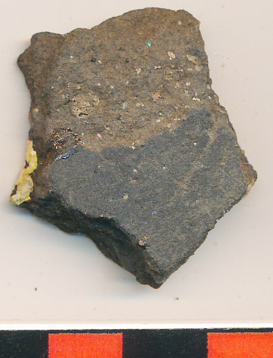 Fekete, kívül-belül eldolgozott, de nagyrészt letöredezett felületű, vékonyabb falú edény oldaltöredéke.