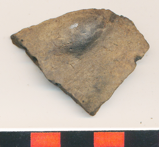 Szürkésfekete, vékony falú oldaltöredéke kis nyelv alakú bütyökkel.