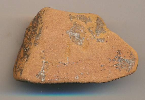 Téglaszínű, korongolt edény enyhén íves, erősen kopott oldaltöredéke.