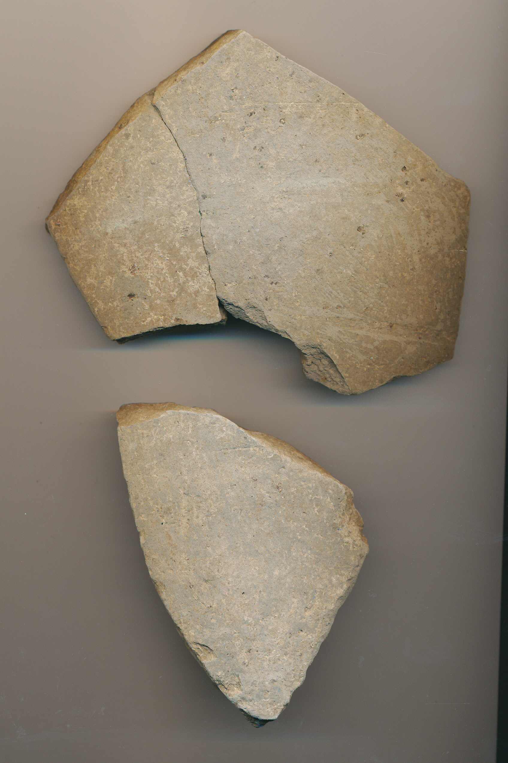 Világosszürke, korongolt, vastag falú edény (valószínűleg hombár) két oldaltöredéke belsejében korongolási hurkákkal. Az egyik két darabból ragasztott.