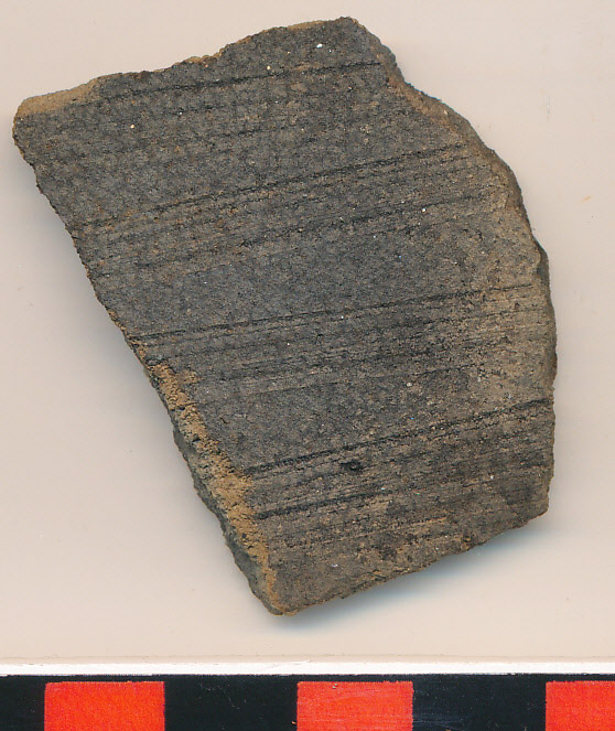 Szürkésfekete külső felületű, alatta barna réteggel, sötétszürke törésű, homokos anyagú, korongolt edény enyhén ívelt oldaltöredéke vízszintesen befésült sűrű vonalkötegekkel.