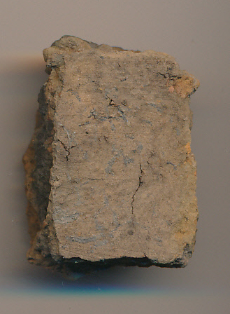 Piszkos téglaszínű, törésében legbelül sötétszürke, kerámiazúzalékkal erősen soványított, eldolgozott külső-belső felületű, vékonyabb falú, korong nélkül készített edény kis egyenes oldaltöredéke.