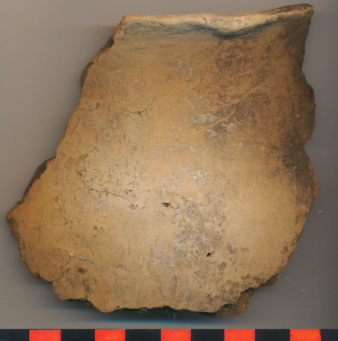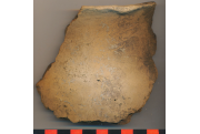 Téglaszínű, kívül egy helyen fekete kormos, kerámiazúzalékkal soványított, korong nélkül készített, eldolgozott külső-belső felületű kisebb fazék enyhén kihajló, elvékonyodó, alacsony peremű, íves vállú töredéke.
