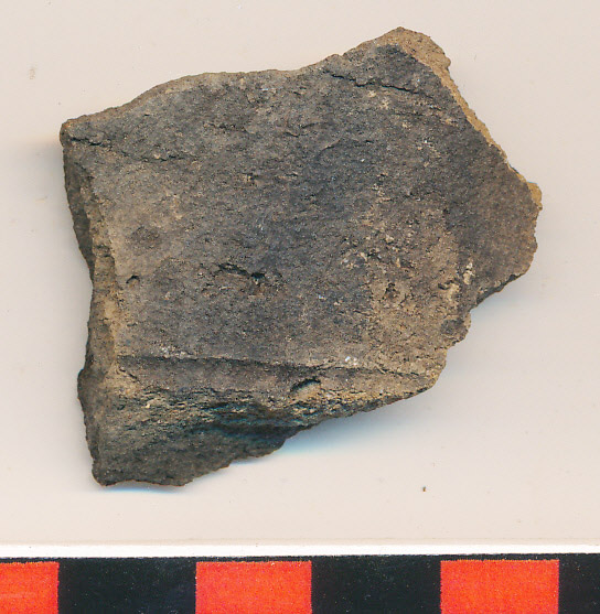Fekete külső felületű, alatta drapp réteggel fekete törésű, homokos anyagú, korongolt edény oldaltöredéke vízszintesen bekarcolt vonallal.