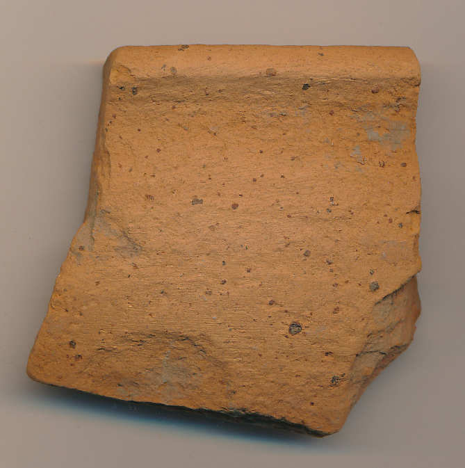 Téglaszínű, belső felületén fekete kissé kormos, korongolt, ferdén enyhén kihúzott peremű, gömbölyű vállú tál töredéke.
