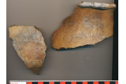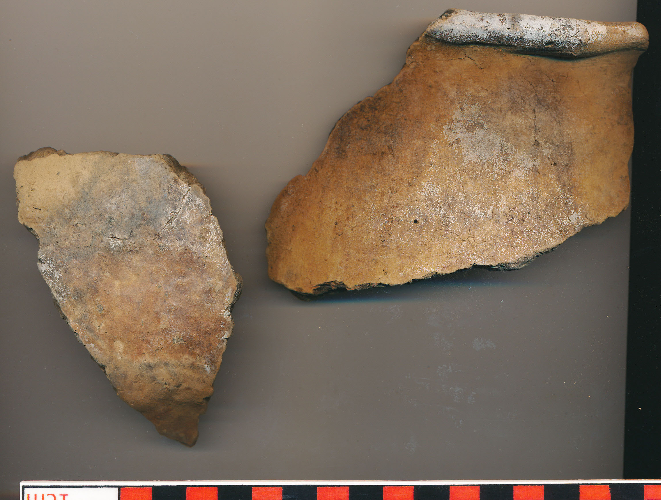 Téglaszínű, illetve barna foltos, kívül másodlagosan zománcosra égett, szürkésfekete törésű, kerámiazúzalékkal soványított, korong nélkül készített, eldolgozott külső-belső felületű fazék kihajló peremű, íves vállú perem-, illetve válltöredéke.