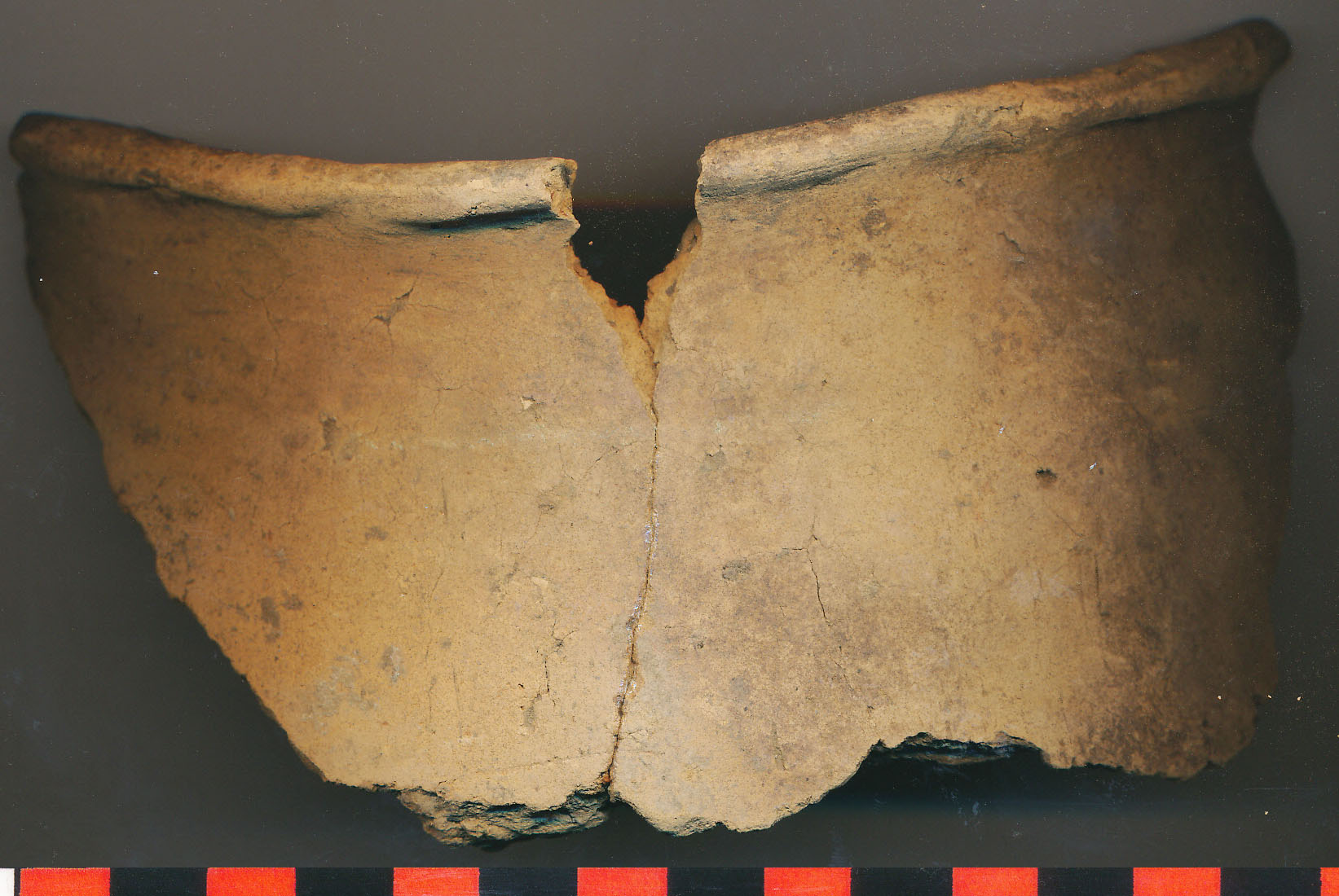 Téglaszínű, kívül-belül helyenként fekete kormos, kerámiazúzalékkal soványított, korong nélkül készített, eldolgozott külső-belső felületű kisebb fazék enyhén kigyűrt, alacsony peremű, meredek vállú töredéke. Két darabból ragasztott.