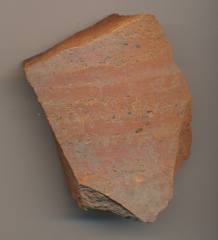 Sötétebb téglaszínű, korongolt, külső felületén sávosan simított, vastag falú edény (hombár) kisebb egyenes oldaltöredéke.