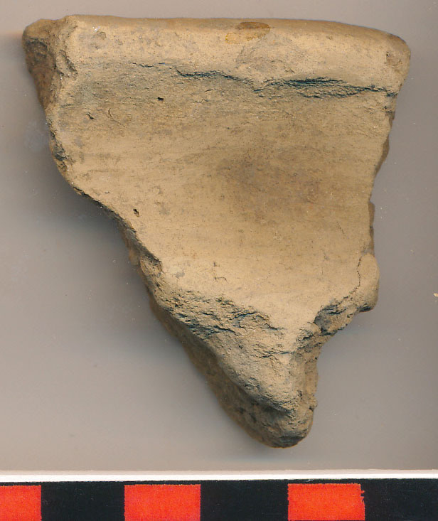 Téglaszínű, belül szürke foltos,, kerámiazúzalékkal soványított, korong nélkül készített, eldolgozott külső-belső felületű fazék legömbölyített peremű, deformálódott nyakú töredéke.