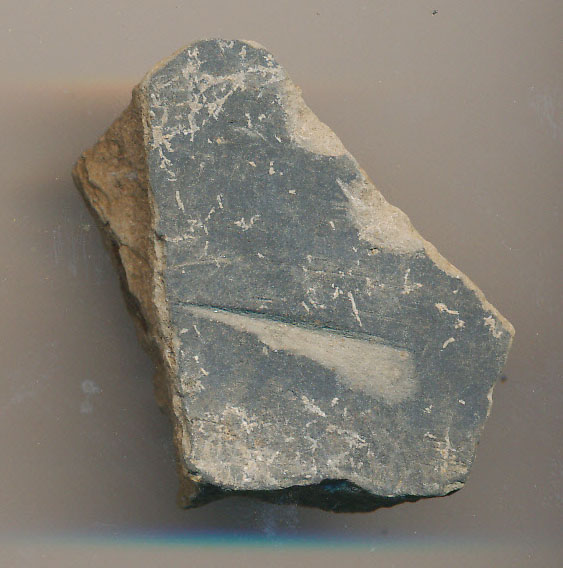 Kívül-belül sötétebb szürke felületű, világosabb törésű, kívül simított, korongolt edény egyenes oldaltöredéke.