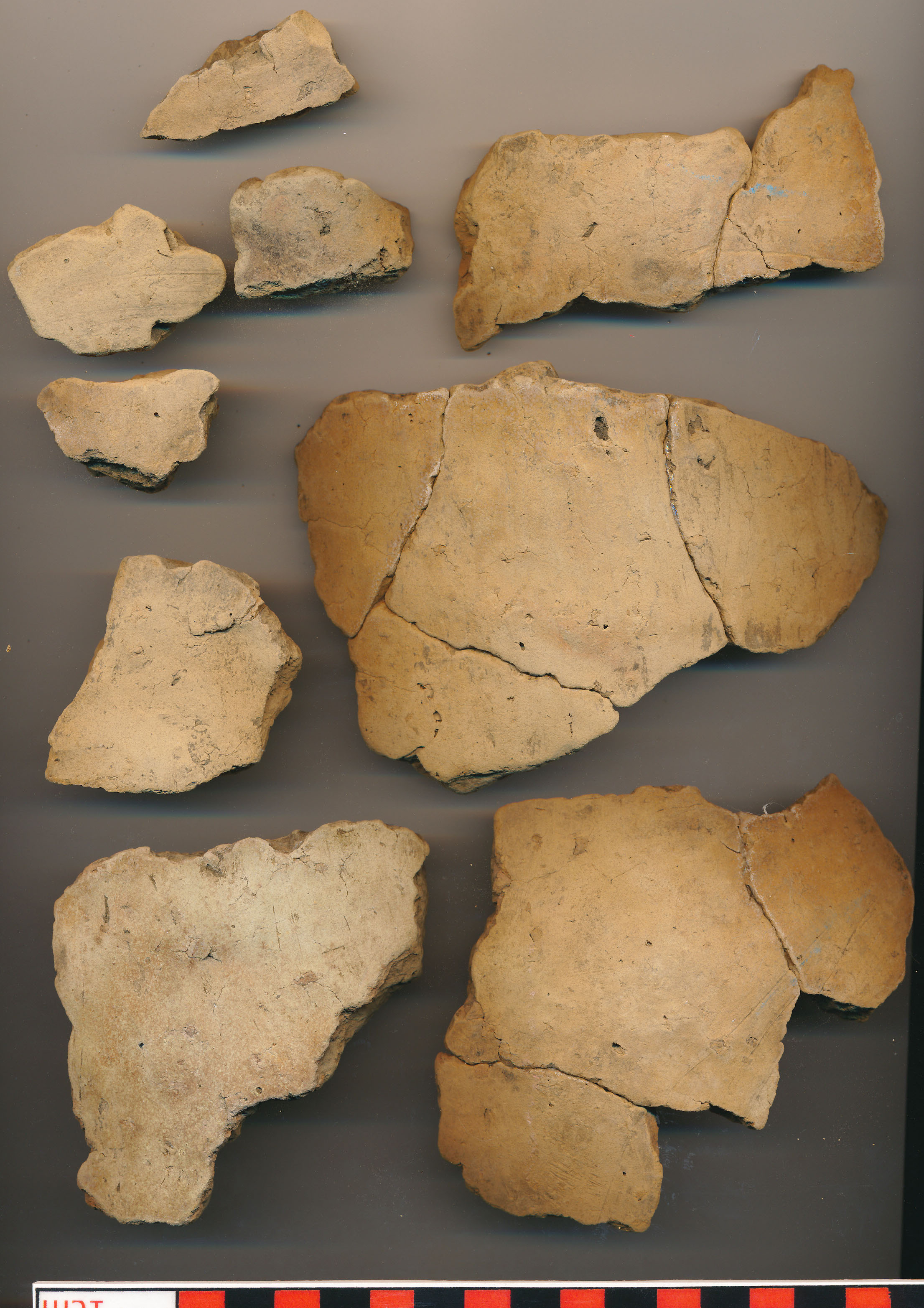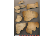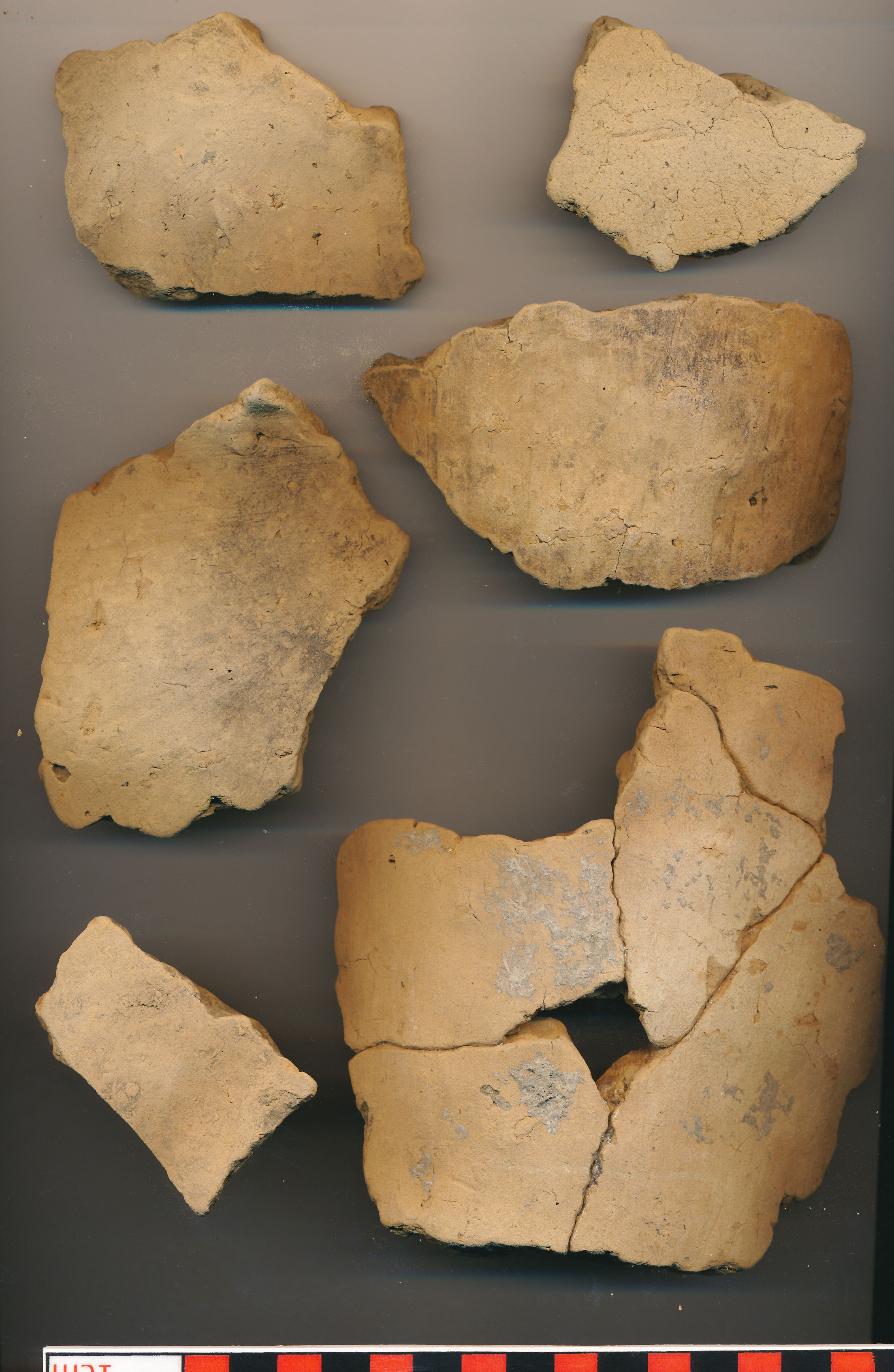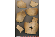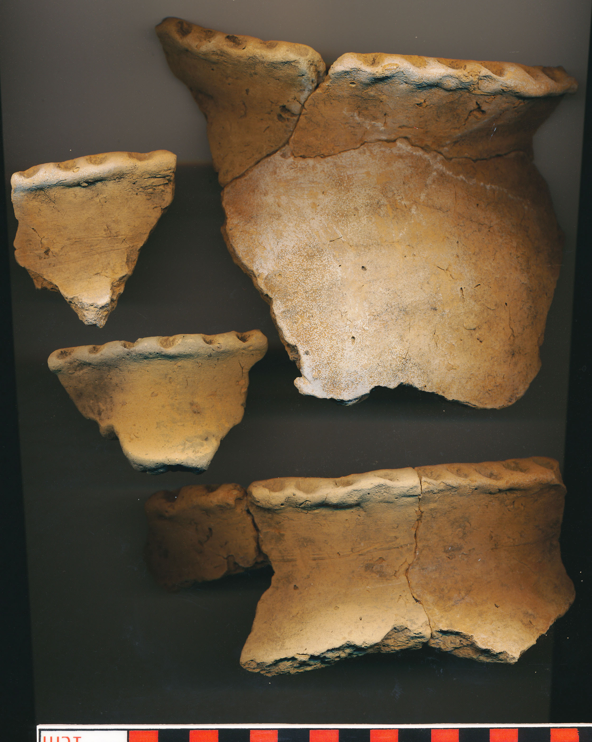 Téglaszínű, helyenként szürkésfekete törésű, kerámiazúzalékkal soványított, korong nélkül készített, eldolgozott külső-belső felületű erősen kihajló, sűrű benyomkodásokkal díszített peremű, íves vállú, vágott aljú nagyobb fazék töredékei. Kívül-belül több helyen elsimítás nyomai rajta. (4 perem, 1 nagyobb alj, 15 oldaltöredék, összesen 50 töredékből ragasztgatva)