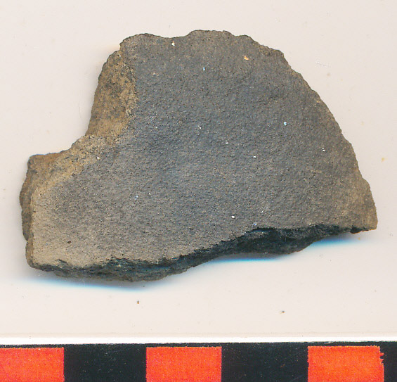 Sötétszürke, homokos anyagú, korongolt edény jellegtelen oldaltöredéke.