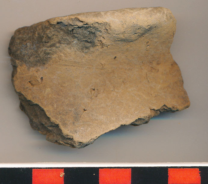 Téglaszínű külső-belső felületű, fekete törésű, kevés kerámiazúzalékkal soványított, korong nélkül készített vékony falú edény kívül-belül eldolgozott, kihajló peremtöredéke.