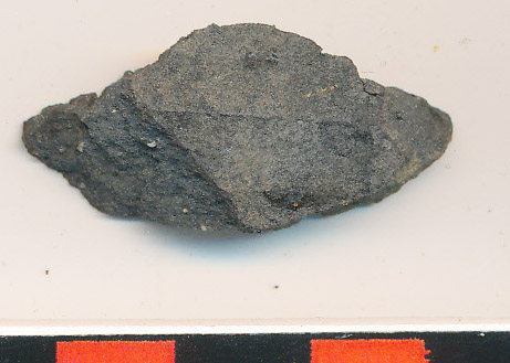 Fekete, homokos anyagú, korongolt edény jellegtelen oldaltöredéke a külső felületén korongolásból származó sekély benyomott relieffel.