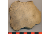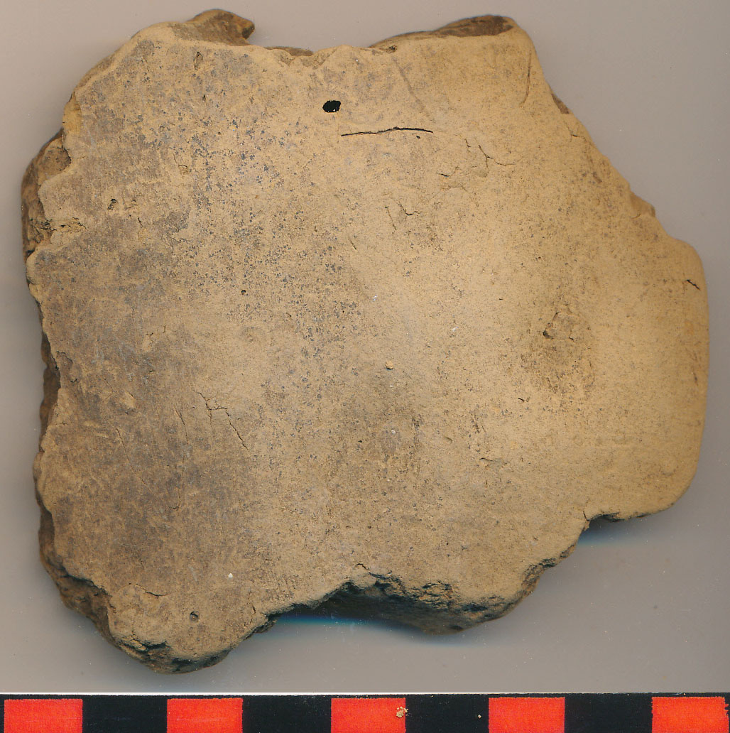 Piszkossárga, helyenként fekete foltos, kevés kerámiazúzalékkal soványított, korong nélkül készített nagyobb edény kívül-belül eldolgozott, egyenes, erősen kopott oldaltöredéke.