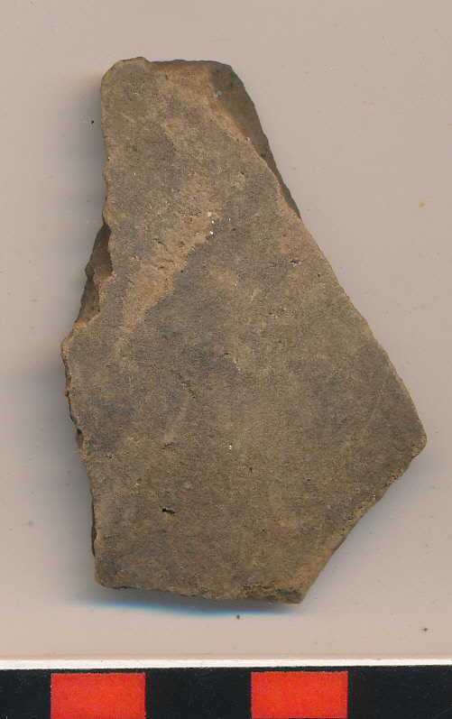 Sárga, eldolgozott külső felületű, fekete törésű, homokos anyagú, korongolt edény jellegtelen oldaltöredéke.