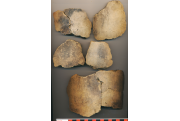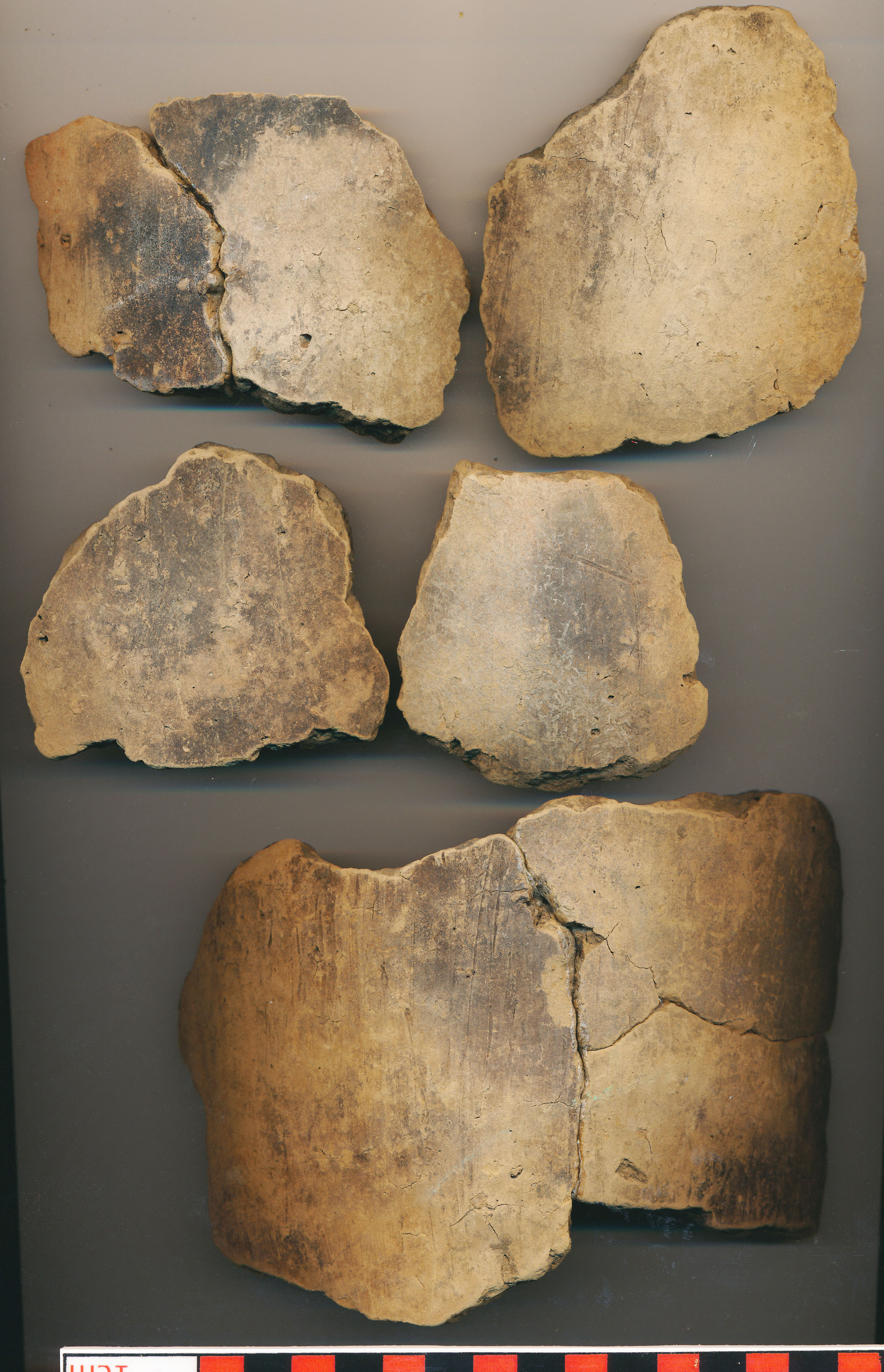 Piszkossárga, helyenként fekete foltos, kevés kerámiazúzalékkal soványított, korong nélkül készített nagyobb edény kívül-belül eldolgozott, íves oldaltöredékei. Kívül-belül jól látszik a felület függőleges elsimítása. Közülük egy 2 db-ból, egy pedig 3 db-ból ragasztott.