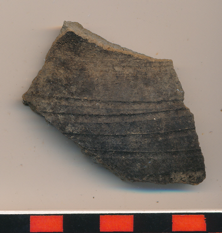 Külső felületén fekete foltos szürke, a belsőn világosbarna, szürke törésű, homokos anyagú, korongolt edény íves válla, az íves nyak indításával. A vállon sűrűn bekarcolt vonaldísz fut körbe.