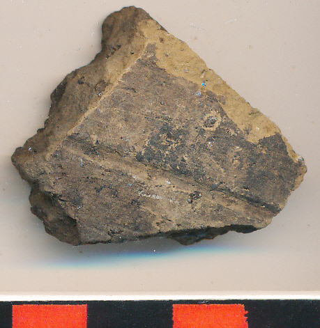 Fekete foltos sötétbarna külső felületű, fekete törésű, kissé homokos anyagú, korongolt edény oldaltöredéke két bekarcolt körbefutó vonallal.