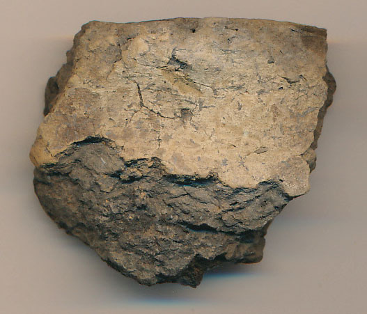 Külső felületén piszkosdrapp, fekete törésű, korong nélkül készített, kerámiazúzalékkal soványított edény enyhén kihajló, elvékonyodó peremtöredéke.