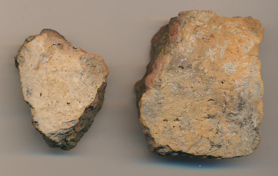 Kívül-belül téglaszínű, szürke törésű, kerámiazúzalékkal soványított, korong nélkül készített edény két jellegtelen oldaltöredéke.