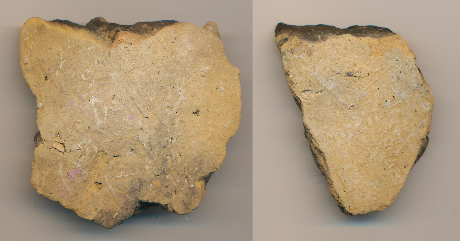 Kívül-belül téglaszínű, fekete törésű., kevés kerámiazúzalékkal soványított anyagú, korong nélkül készített nagy, vastag falú edény 2 oldaltöredéke. Valószínűleg az előző számon leltározott edény töredékei.