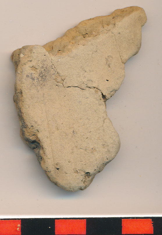 Sárga, szürke törésű, kevés kerámiazúzalékkal soványított, korong nélkül készített vékony falú edény kívül-belül eldolgozott egyenes, erősen kopott oldaltöredéke.