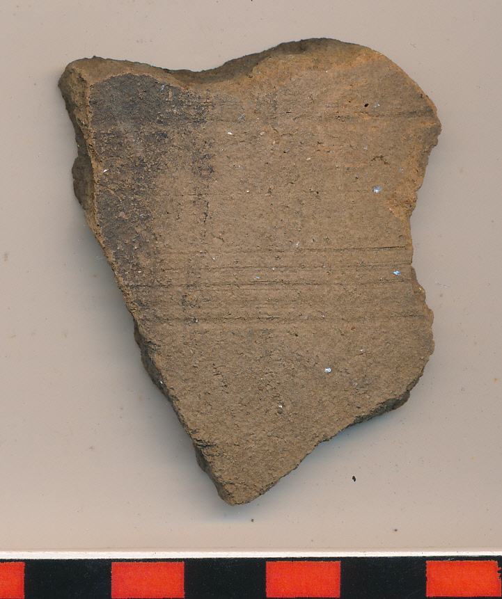 Külső felületén drapp, a belsőn fekete, homokos anyagú, korongolt edény oldaltöredéke, 2 körbefutó befésült vonalköteggel..
