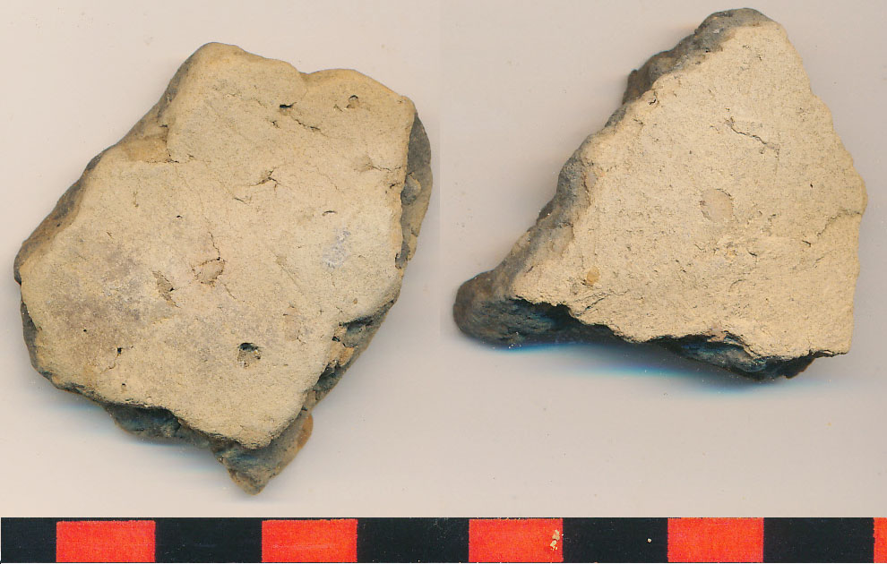 Sárga külső-belső felületű, szürkésfekete törésű, kevés kerámiazúzalékkal soványított, korong nélkül készített kisebb edény kívül-belül eldolgozott két oldaltöredéke.